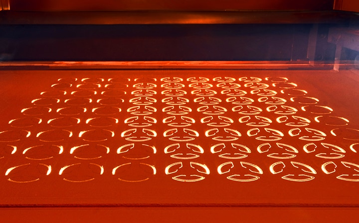 合計1200W(300W × 4基)の強力なファイバーレーザーと、最高20m/sの超高速スキャンシステムを搭載。従来のCO₂レーザー機と比較して、数倍の造形スピードを実現しました。 大型部品の高速製造はもちろん、コネクタや筐体といった数千個単位の小型部品を一度に製造する「高密度ネスティング造形」において、真価を発揮します。