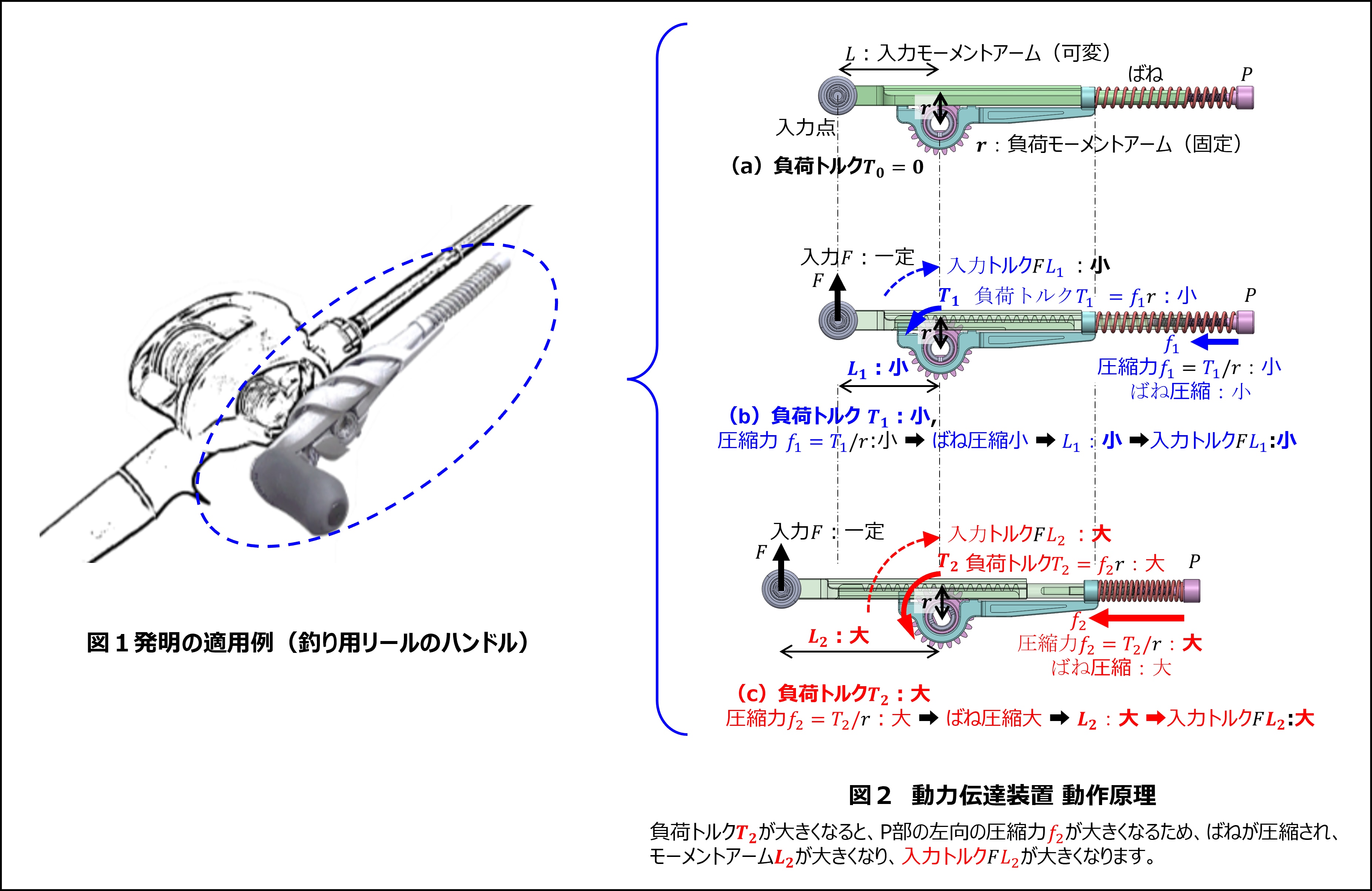 負荷トルクの増大により、ばねに作用する圧縮力f2=T2/rがばねの復元力を超えると、ばねが圧縮され、入力点の位置が移動します。これにより入力モーメントアーム L2が増大します。その結果、入力荷重 Fがほぼ一定である場合であっても、入力トルク F L2は自動的に増加します。本装置は、このようにして負荷トルクに応じた適切な入力トルクを機械的に生成します。