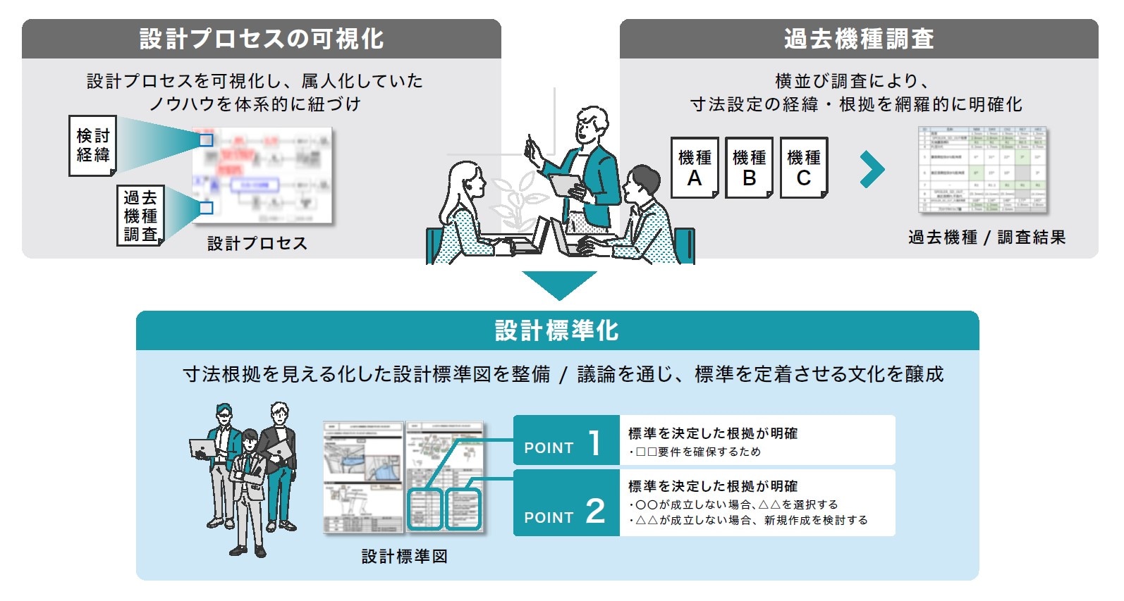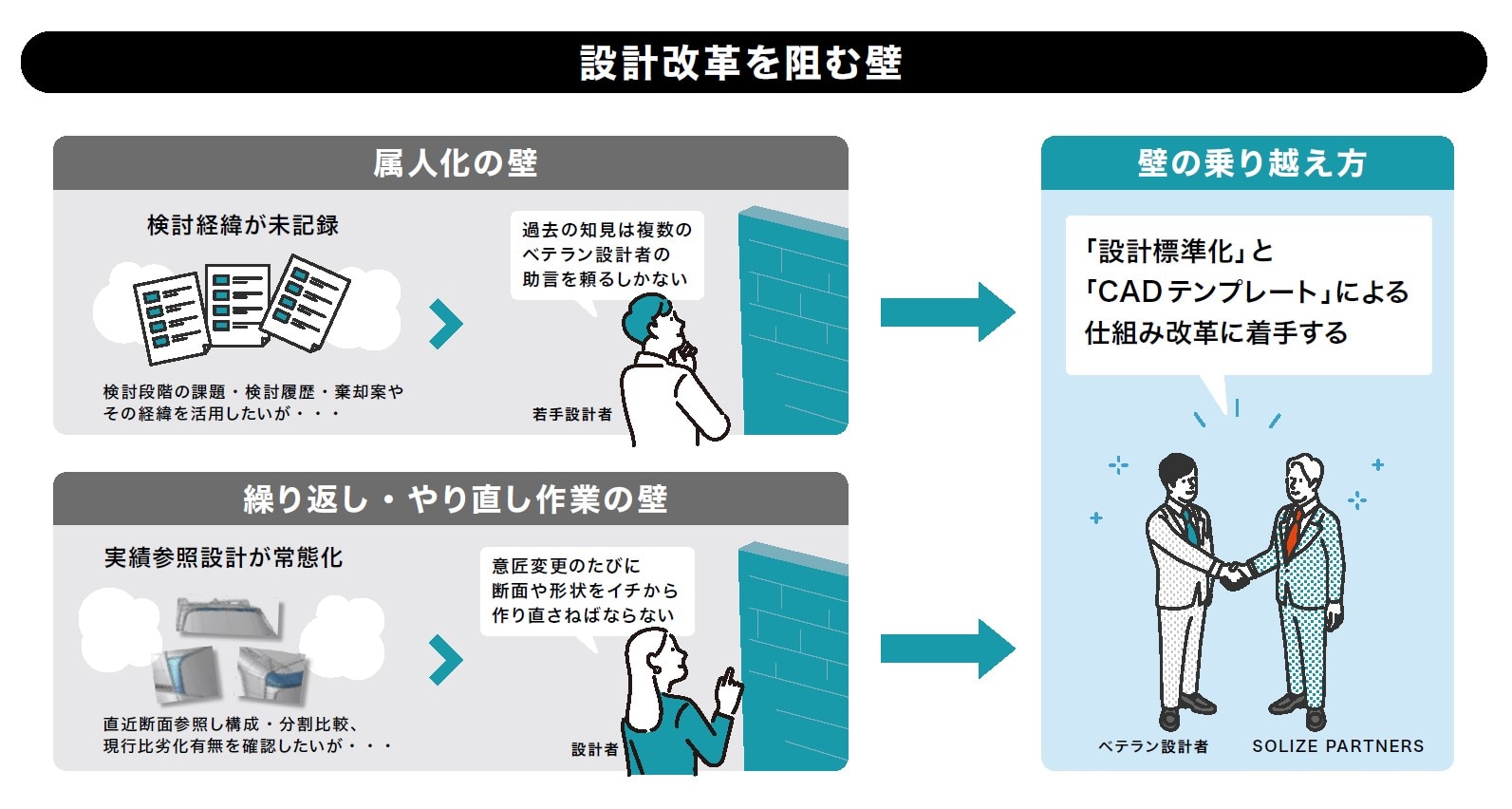 こうした課題を解決するため、外装設計課※1に常駐するSOLIZE PARTNERSの設計エンジニアは、誰でも同じ品質で設計できる仕組みづくりとして、「設計標準化」と「CADテンプレート構築」を提案し、着手しました。