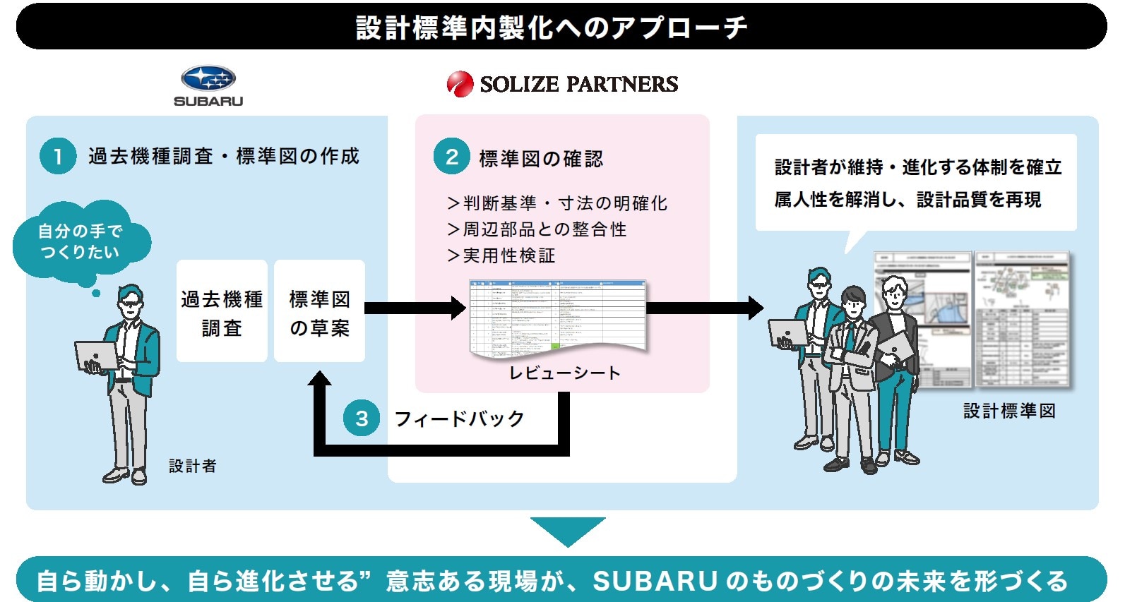 SOLIZE PARTNERSの設計エンジニアは、SUBARUのベテラン設計者へのヒアリングを重ね、ノウハウや過去機種の調査を実施し、判断基準や上下限値も精査しました。寸法設定の経緯や根拠が一目でわかる設計標準図の作成に向け、開発プロセスや判断基準の一つひとつを可視化し、設計標準図の作成を主導しながら整備していきました。