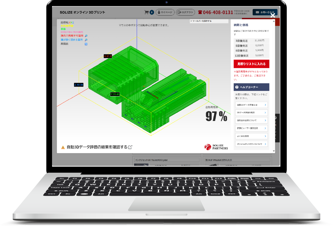自動3Dデータ評価システムは「SOLIZEオンライン3Dプリント」の独自のサービスで、誰でも無料で簡単に、お客さまがアップロードした3Dデータに対し、3Dプリントに係る価格の算出、および3Dプリントの形状の再現性を評価できるシステムです。