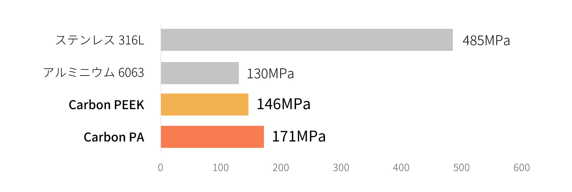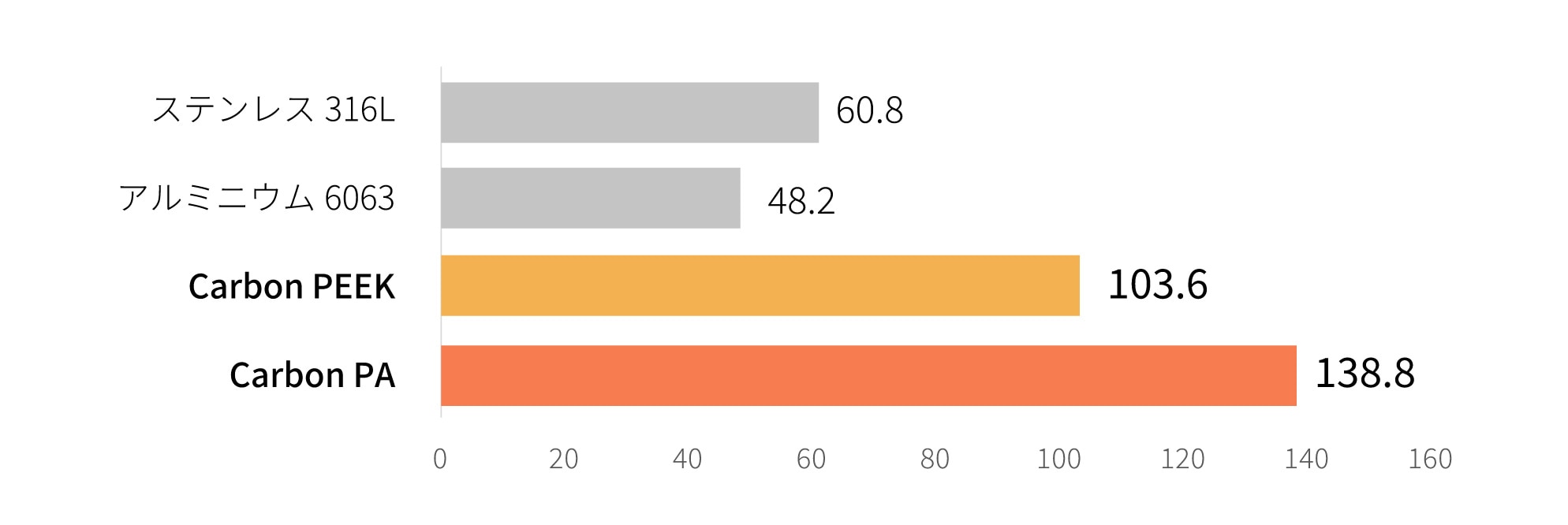 一般的なアルミニウム材料に比べ、RobozeのCarobn PEEKおよびCarbon PAは引張強度が高いという特長があります。