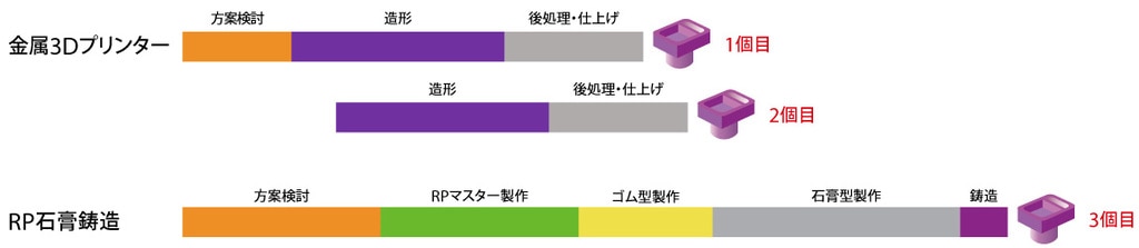 鋳造での製作と同時並行で、金属3Dプリンターで数個の製作を進めることにより、初品納入までのリードタイムを短縮します。試験日程を遅らせることなく、試作品を納入可能です。
