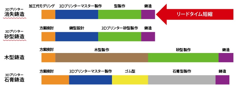 消失マスターモデルを3Dプリンターで造形することで、時間を要する型の製作が不要となるため、短納期での納入が可能となります。また、複雑な形状でも、中子レスでの製作が可能です。型製作の初期費用が抑えられるため、小ロット製作に向いています。