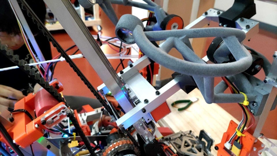 今回の大会では、本番直前の操縦練習に用いる機体で、SOLIZE PARTNERSが3Dプリンターで造形した部品が、ボールの姿勢を揃えるためのアクチュエータおよびボールキャスタを支持する構造部品として使用されました。